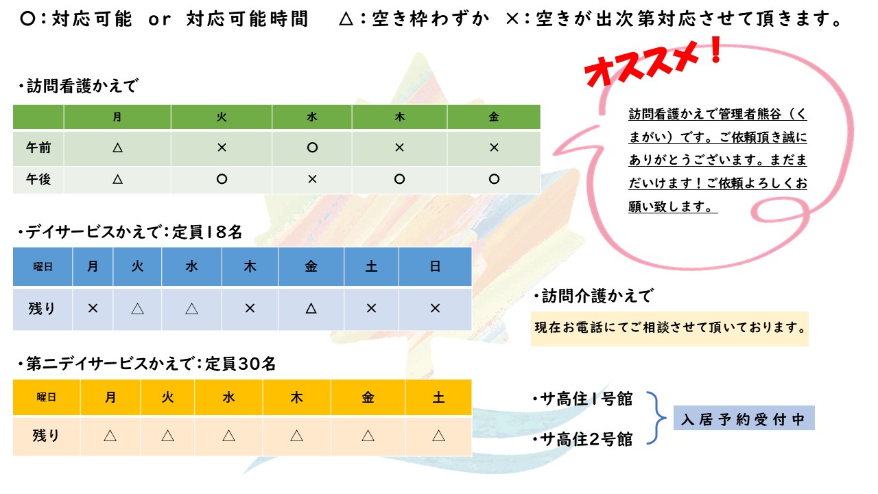 かえで施設内外すべてバリアフリーで、ゆとりのあるスペースを確保しております。また、プライバシーが守られる個室をご提供しながらも、スタッフが24時間365日在中しているので安心していただけます。